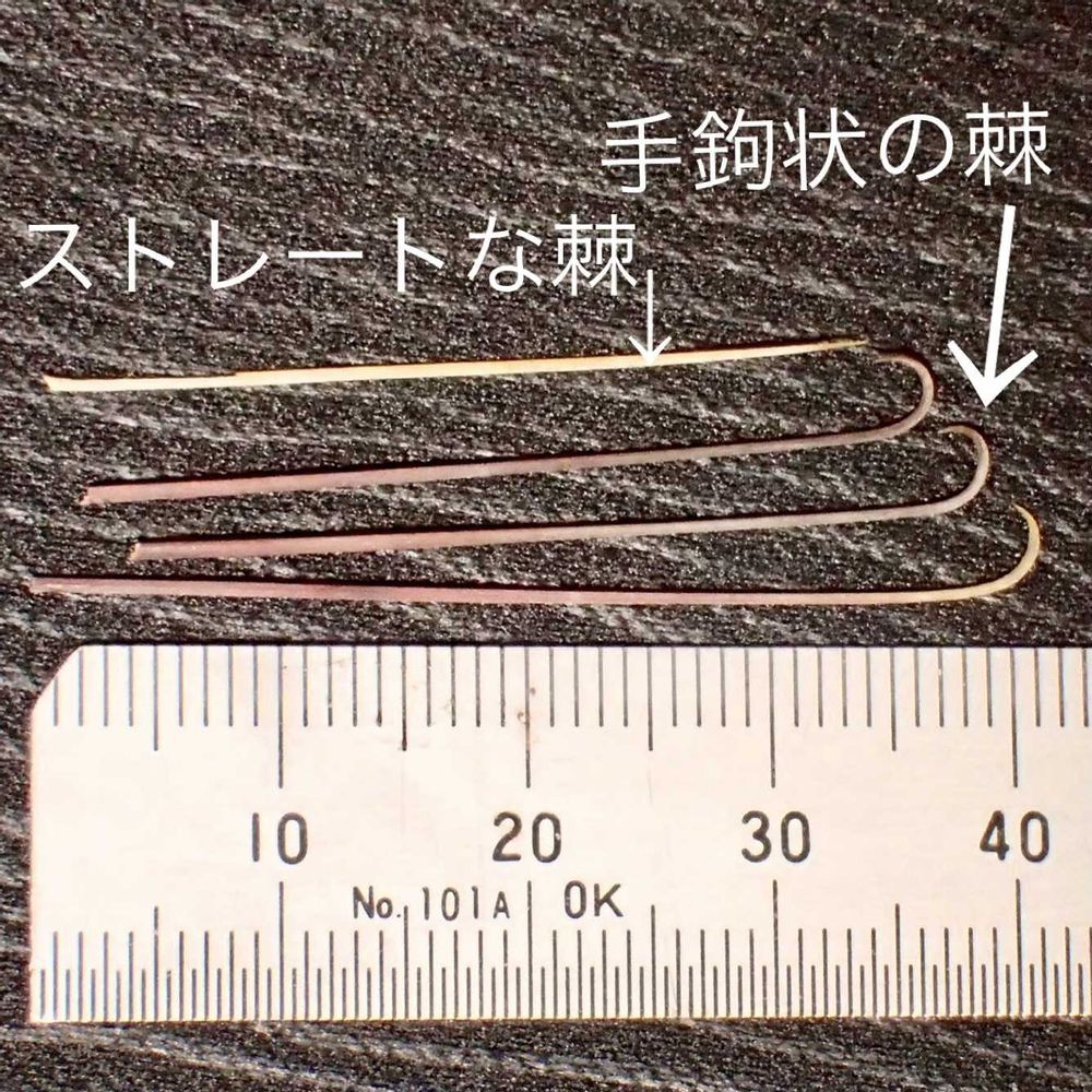 ①フェロカクタス②フェロカクタス棘の特徴 中央の矢印が 手鉤状のカエシが付いている その周囲の棘はストレートの棘③棘の寸法。
