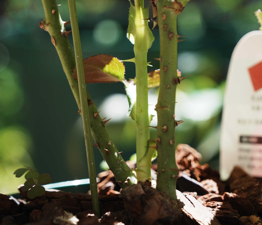 8月に買ってきたまるっパゲだった投げ売り木立バラ、小さなシュートが見えてから1週間程度でほかの枝に見劣りしない太さに成長!