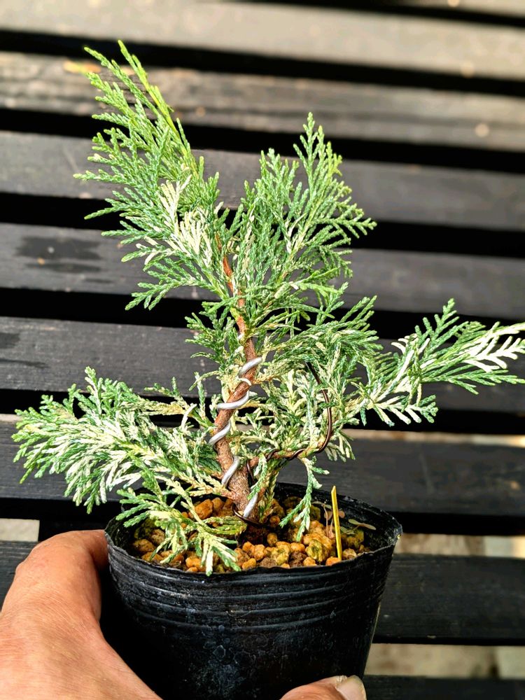 ちょっと早起きして…斑入りヒノキに針金掛ける…😅