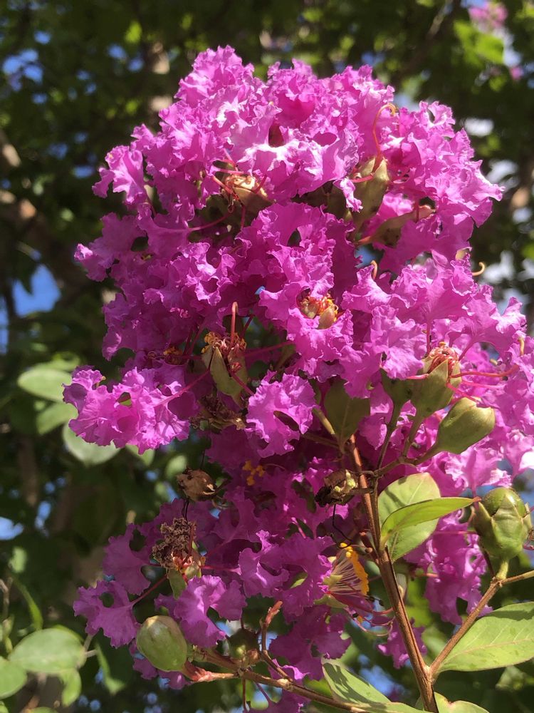 青天の下、ピンク色の「サルスベリ」のお花が映えます。📸💙🩷🌿😄🤗🌞✌️