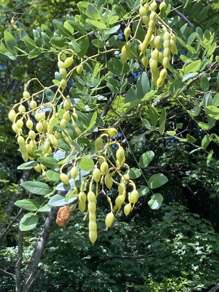さん、二度咲きだったのよね、はじめなんだろうとちかづいて見たらニセアカシアの種、えんどう豆見たいね😊
