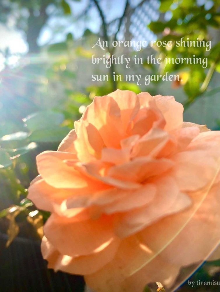 朝日にオレンジ色のバラが明るく輝いていました・*:.。