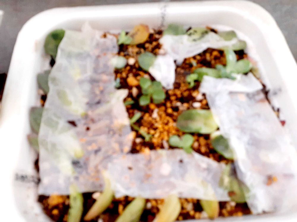 土の上に🌱⋆。置いたままでどのくらい発根発芽するかって事 この夏どうしても発根も発芽もしない子達と新しい葉挿しがたくさんになったので