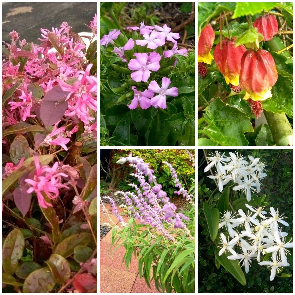 左から、ベニバナトキワマンサク、ハマナデシコ、アブチロン、センニンソウ、そしてアメジストセージ💗♥️💛🤍💜