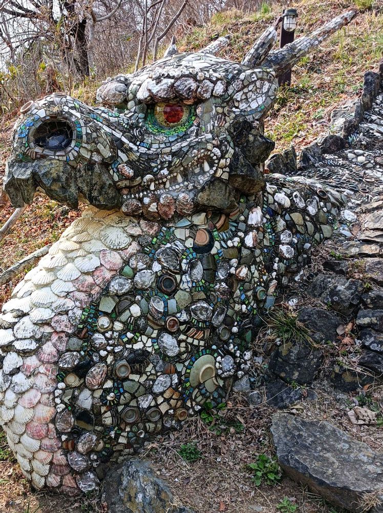 そしてサンドイッチマン達が避難した場所で海を見つめる貝殻を散りばめた龍のオブジェ、力強いエネルギッシュな想いが伝わります~⤴️🎵✌️😀