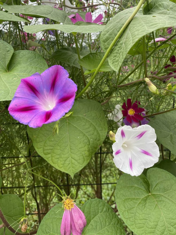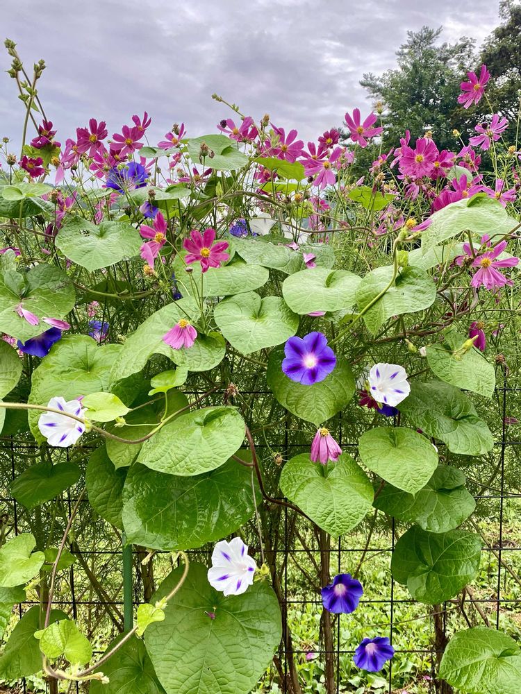 コスモスに朝顔が絡み合ってめちゃくちゃしてま~す😅
