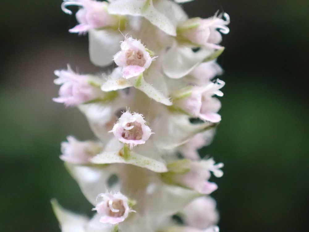 淡いピンク色の花。萼に白い毛が生えています。(④⑤)