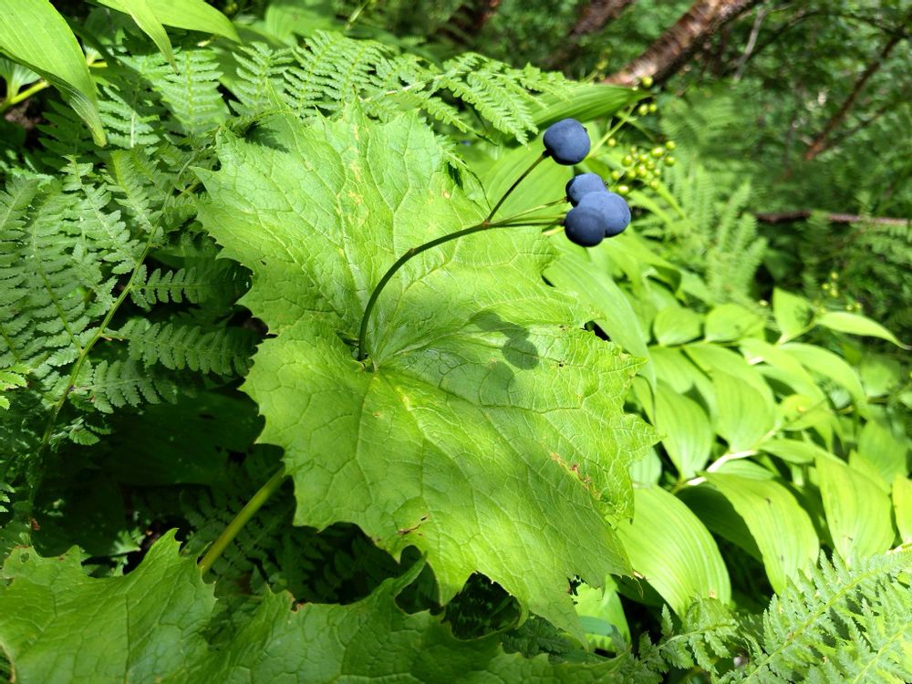 フキのような葉っぱにブルーベリーのような色と大きさの実がなっている不思議な植物です🌱