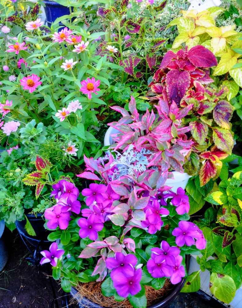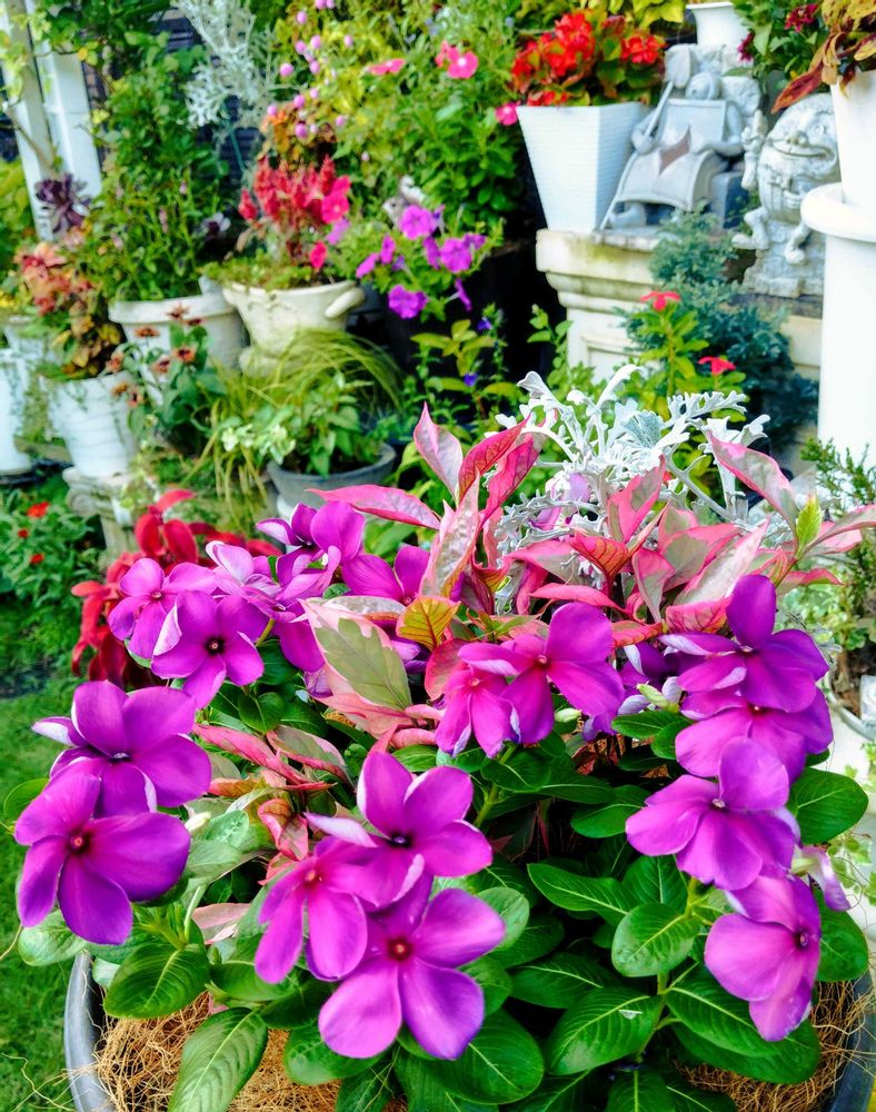 ニチニチソウと赤葉センニチコウ、シロタエギク、栄養系コリウスなど植えてあります🪴