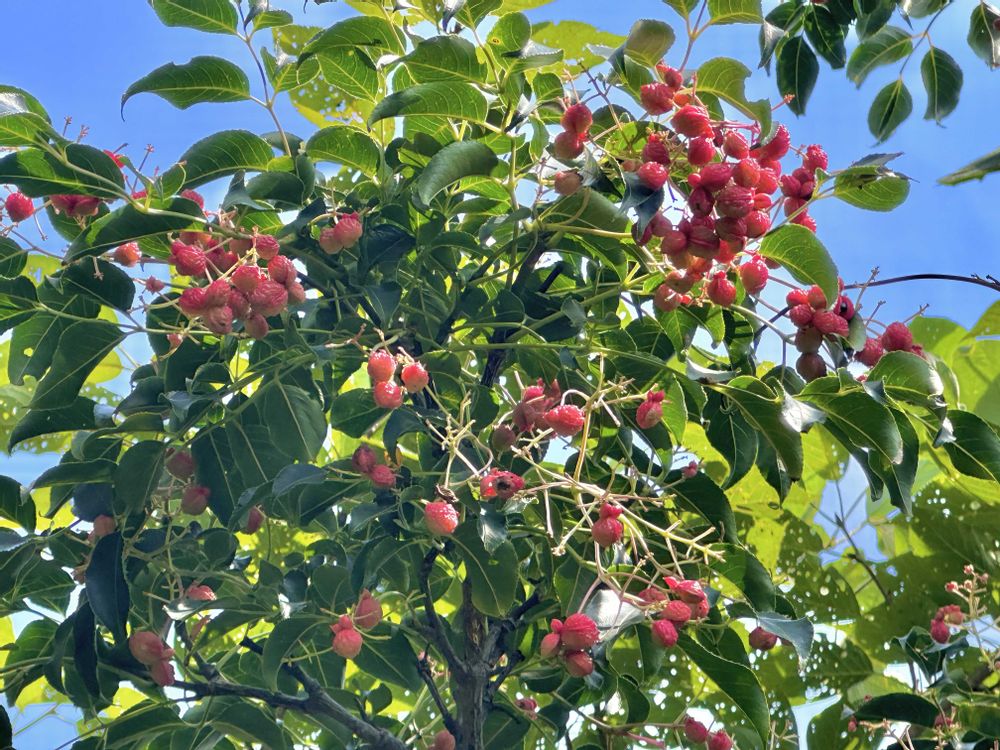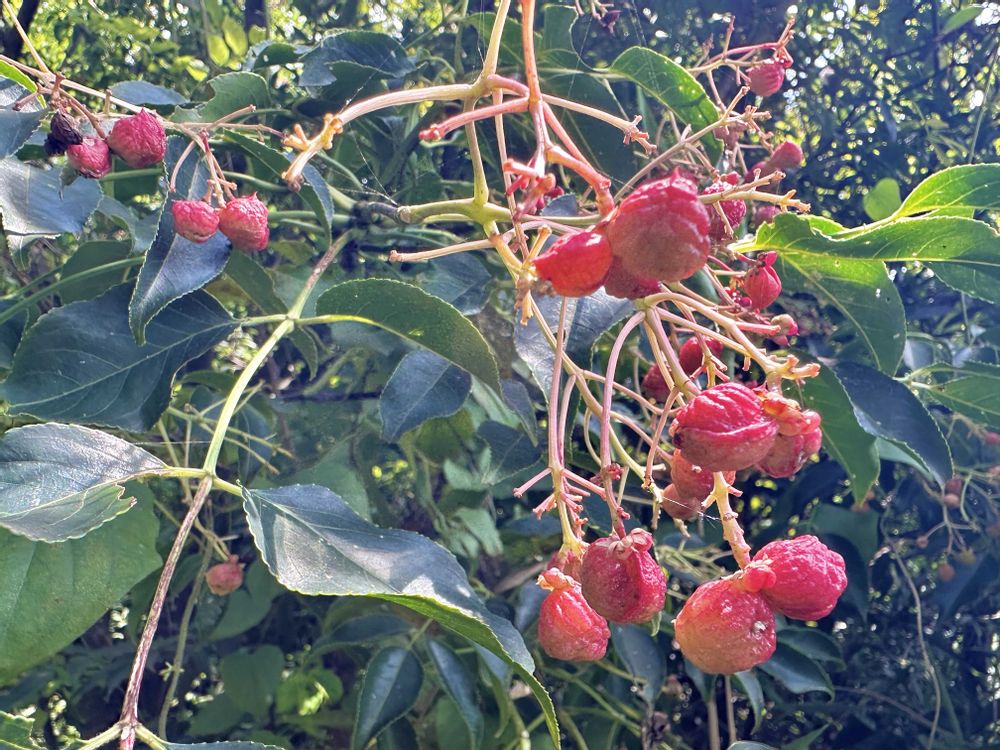 ちょっと高い位置に赤い果実を鈴なりに付けているのは、ミツバウツギ科ミツバウツギ属(ゴンズイ属が統合された)のゴンズイです😍