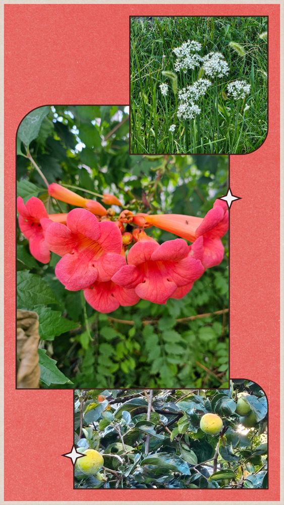 おはようございます。散歩中にノウゼンカズラ・ニラ・柿を撮りました🧡🤍💚