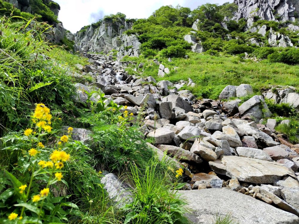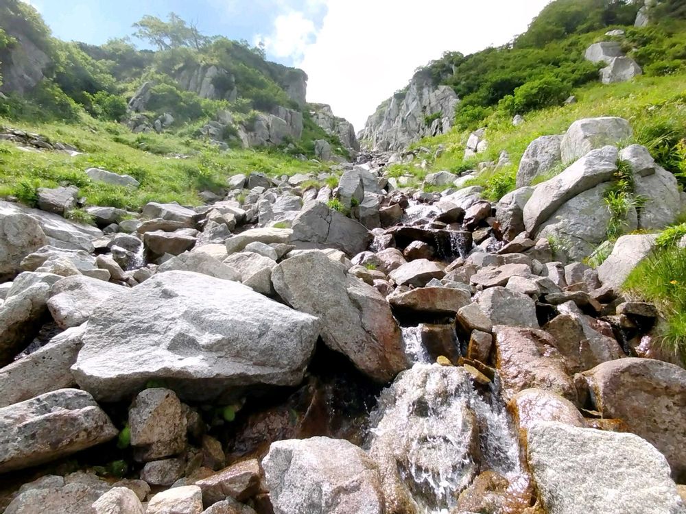 登ってきた木曽駒ケ岳から集まった水が流れ落ちる伊勢滝という名前の滝で、垂直に轟音を立てて落ちる滝とは違い急斜面の岩の間を流れ落ちる感じです🫧
