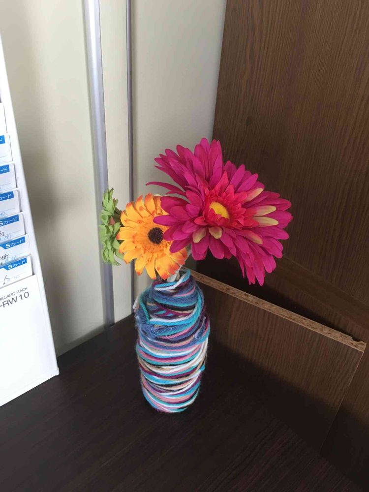 IKEA造花+ジュース空き瓶、毛糸巻 オリジナル花瓶