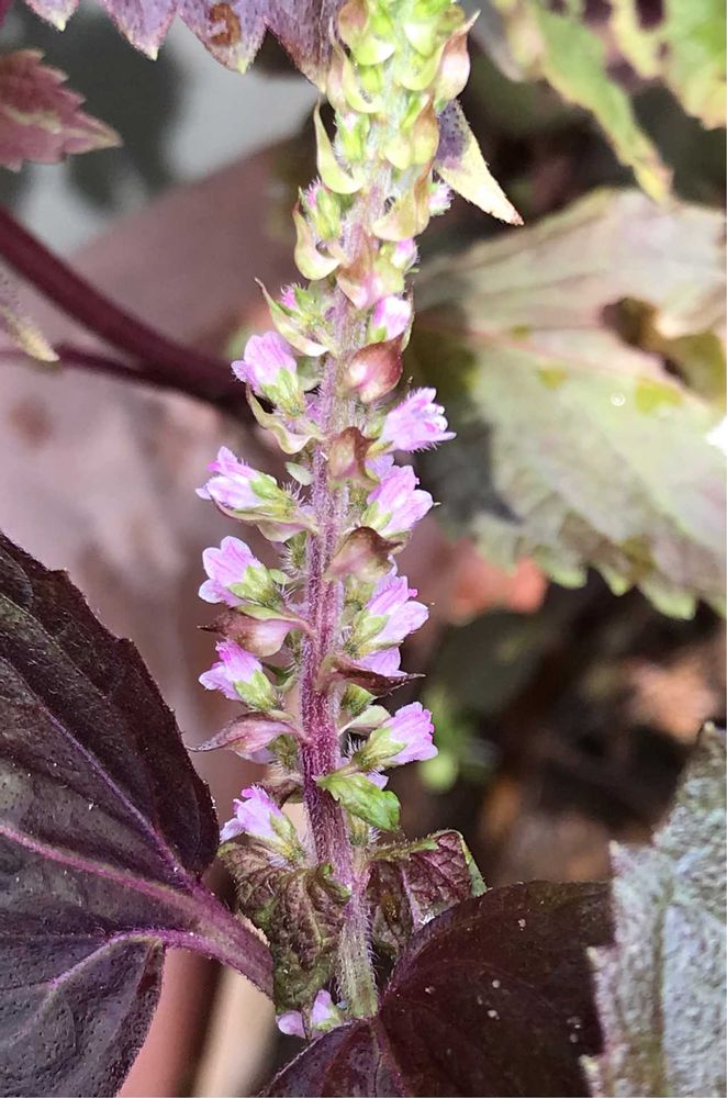 零れ種の地植えの赤紫蘇は、まだ花は咲きません!鉢植えの赤紫蘇は、日当たりが良い場所にあるので、花が早く咲いたのね!。
