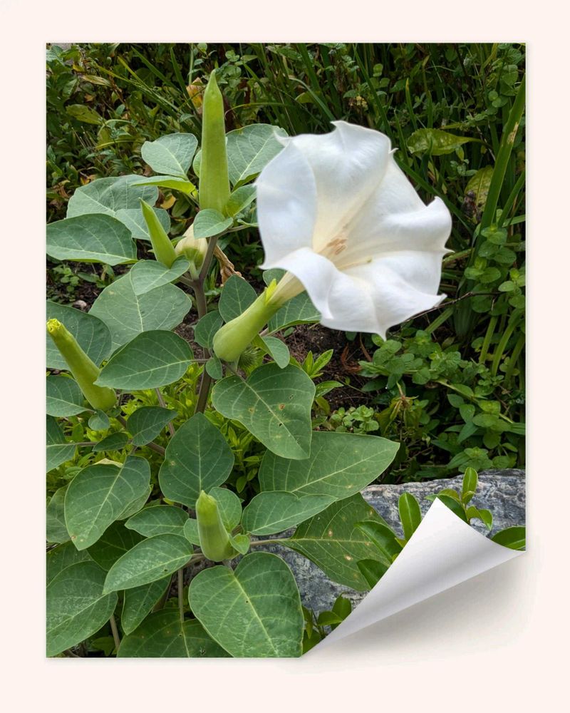 7月に大きなツツジの木を切って断捨離している場所にチョウセンアサガオが咲きました どこからやってきたんだろう❓