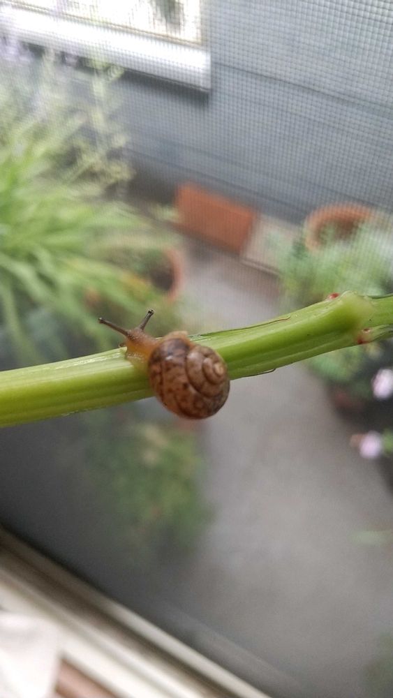 母に持っていこうと下処理をしていたモロヘイヤの茎に、カタツムリ🐌!