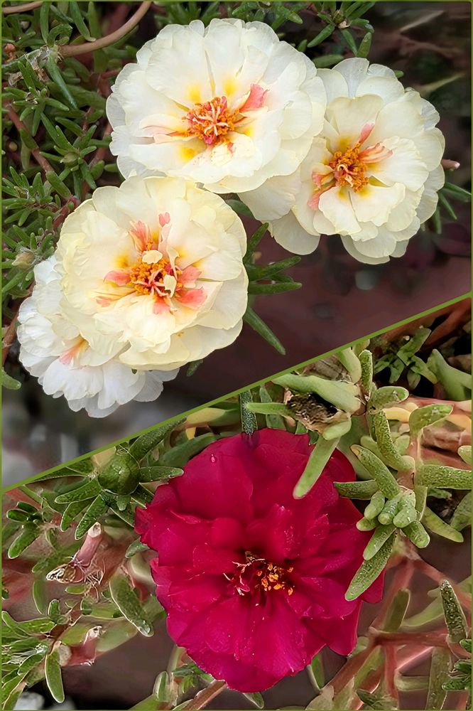 1️⃣ 八重咲きのマツバボタンを種蒔きして育てていましたが、イノシシ🐗に花壇を荒らされ かろうじて 残った2種です。