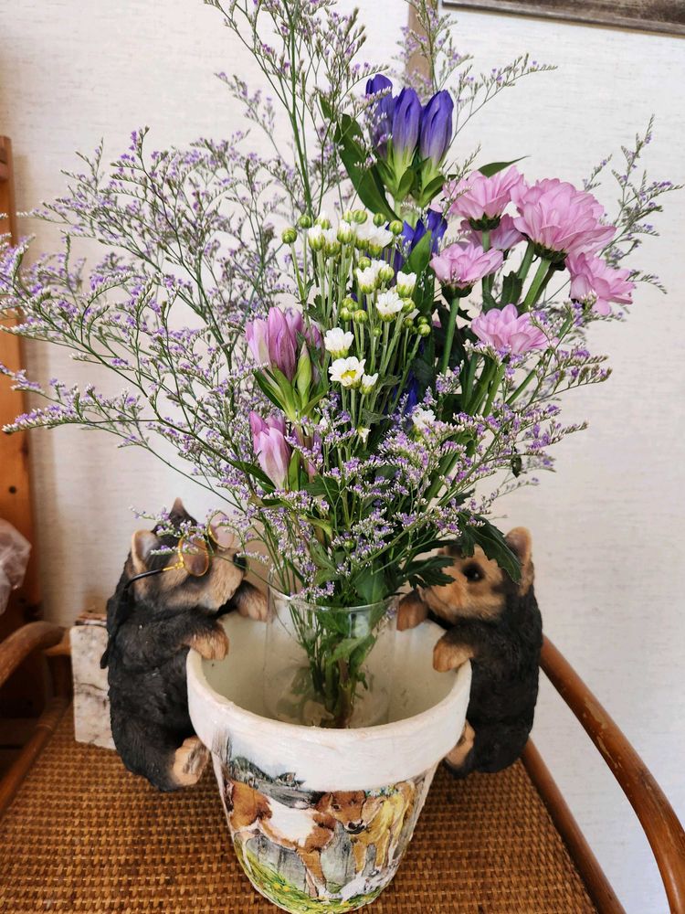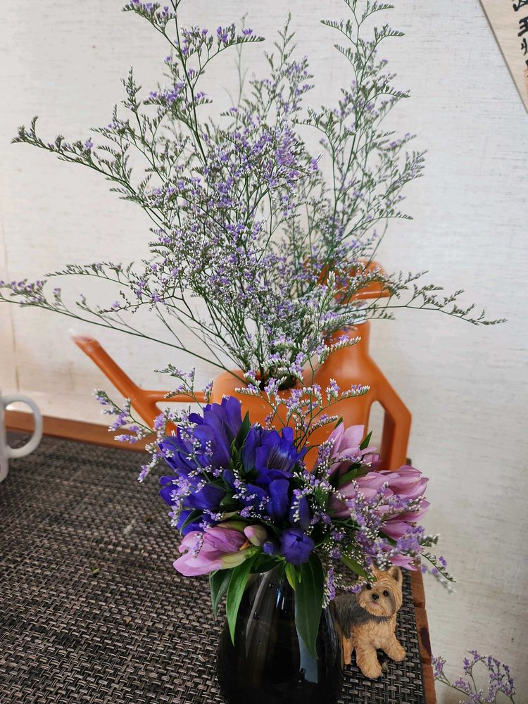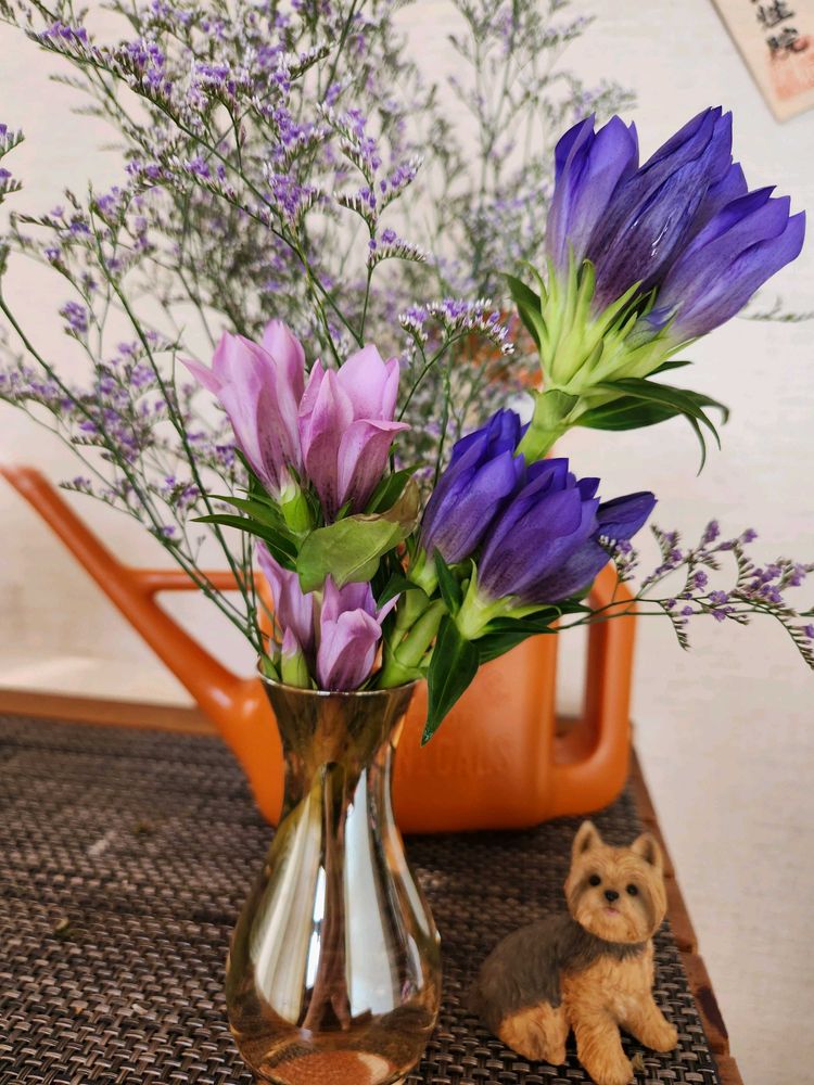 5本買ったのみだけど、竜胆も、わけてみました。宿根スターチス、ボリュームすごい。選んでくれたお花屋さんスタッフさまに、感謝です。