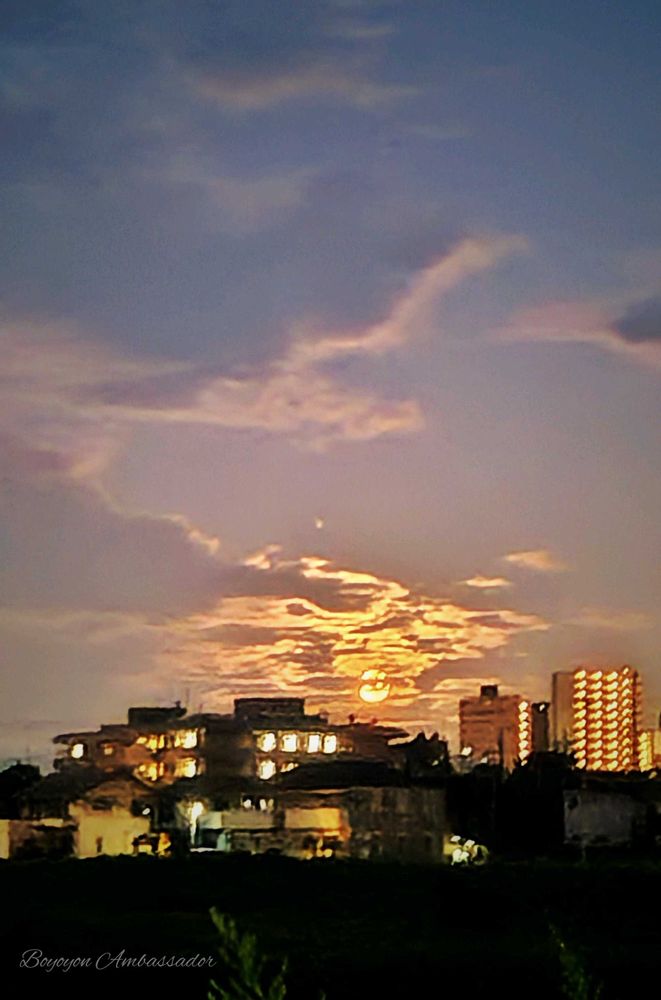 月と朝焼けの雲と街の灯り、すべてが輝いて、とても美しいPicupですね