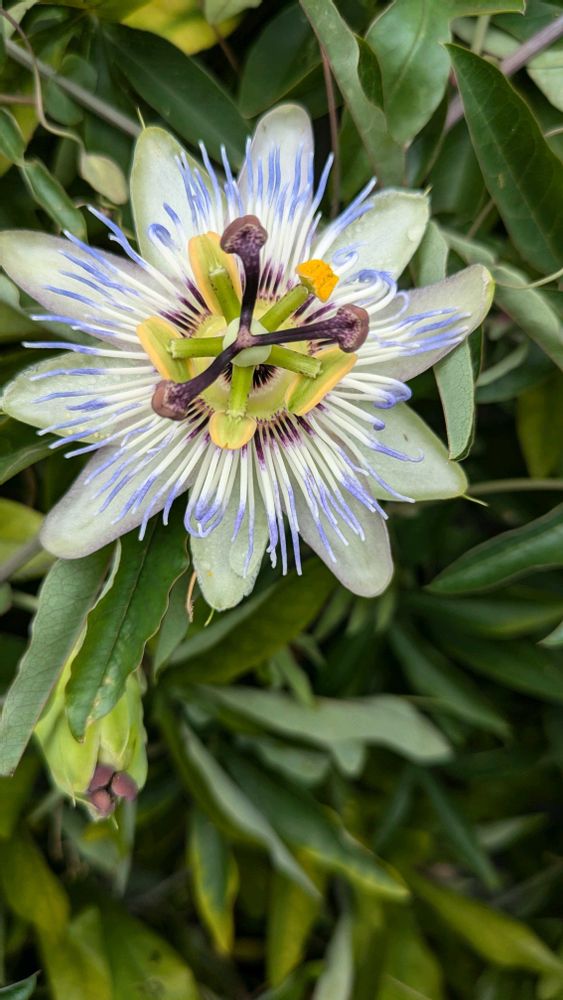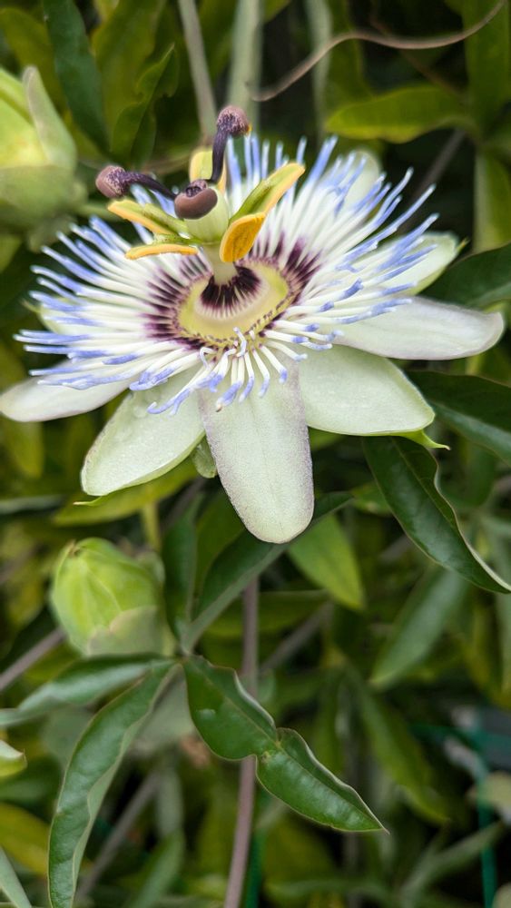 トケイソウのネットの間から顔出しているメガネツユクサもいるよ😁