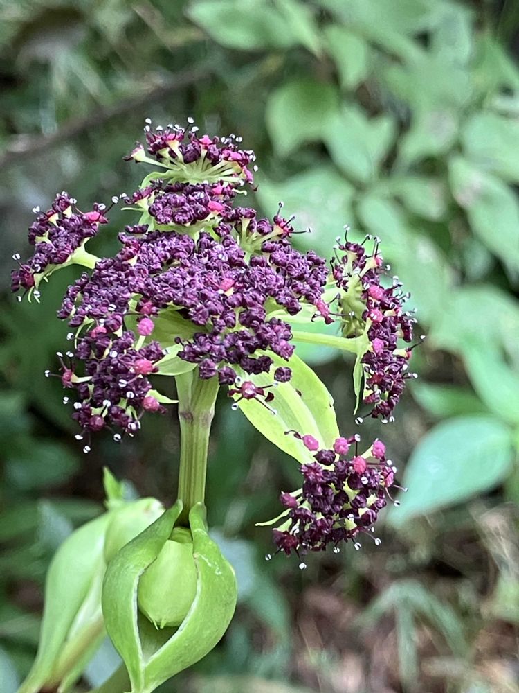 東北以南の湿った草原に生育する、草丈1メートルを超える大型の多年草 秋に暗赤紫色の花序をつける。暗赤紫色の花序は、白い花が多い。セリ科ではよい区別点である。