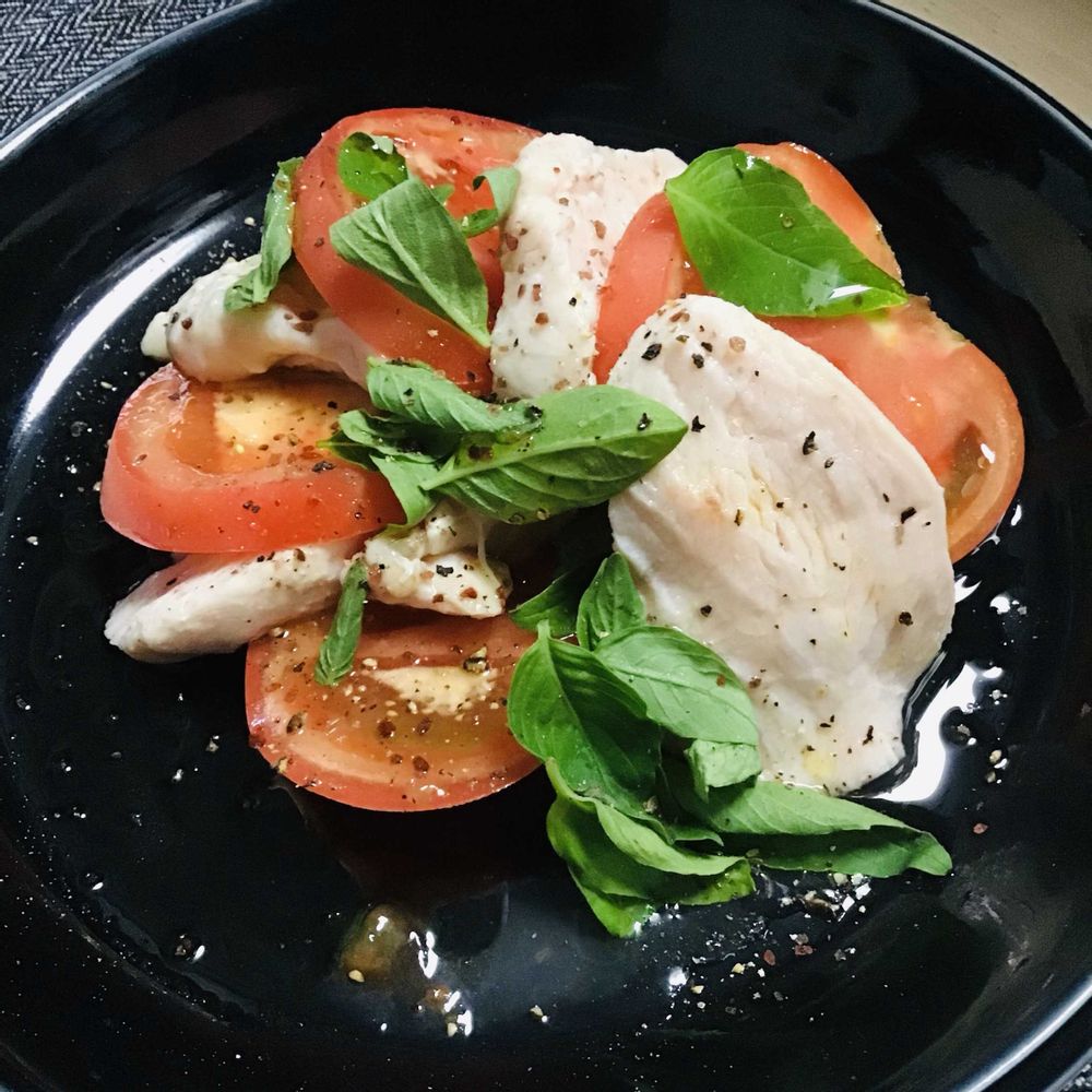 自家製鶏胸肉サラダチキンに、まいばすけっとで購入したトマト一玉、オリーブオイルに挽きたて岩塩と胡椒です。