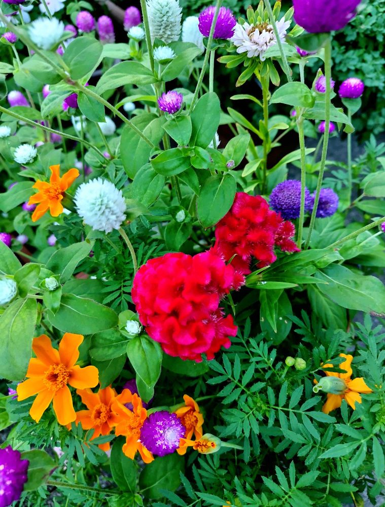 赤いケイトウとセンニチコウとマリーゴールドが きれいに咲いていました😀
