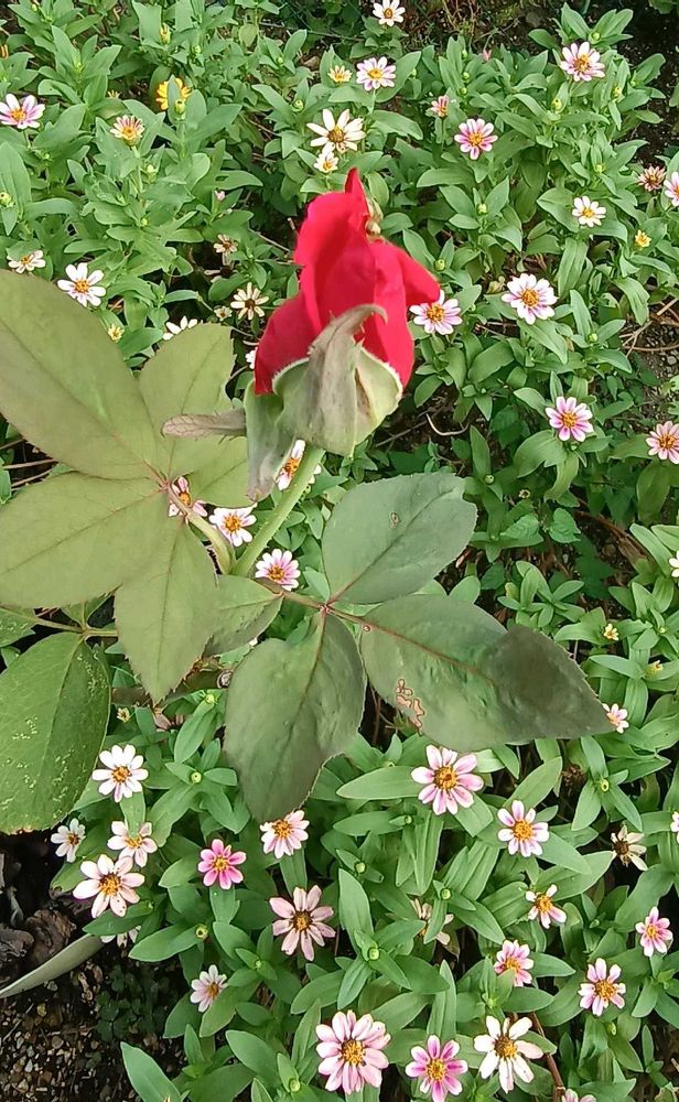 赤いバラのお花🌹と種まきジニアさんのコラボが可愛い💕