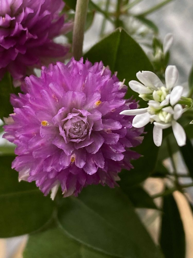 私の小さな庭の、ユーフォルビア・ダイアモンドスノーとセンニチコウを、勤務先へ🍀