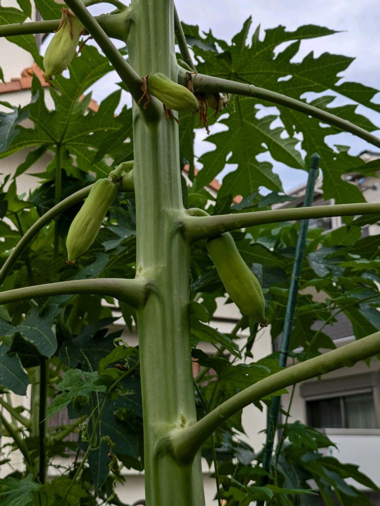 私の雑な記録を見たら、パパイヤ苗をお買い得コーナーから、買って帰ったのは、6月3日でした。まだ、30センチほどのポット苗でした、8倍くらい伸びましたね。