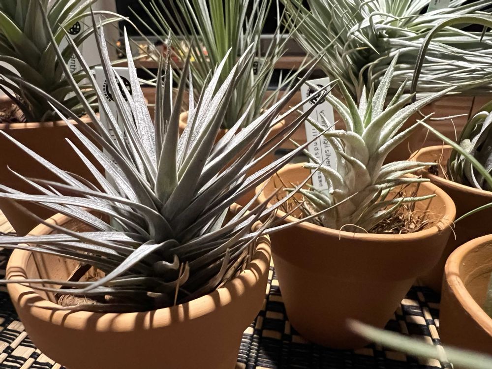 チランジアは根っこのほうが茶色くなってきてるし、チランジアは育成ライト当ててるのになんだか伸び伸び徒長してるし💦