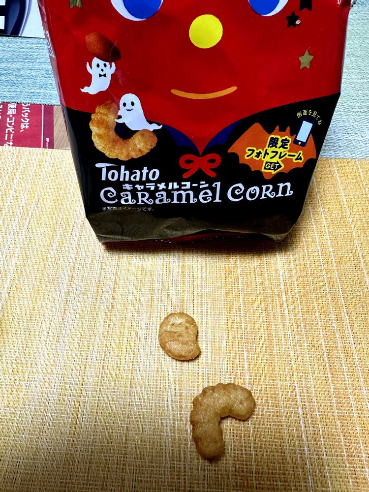 ③ハロウィン限定キャラメルコーンに、おばけ👻が入ってました😄