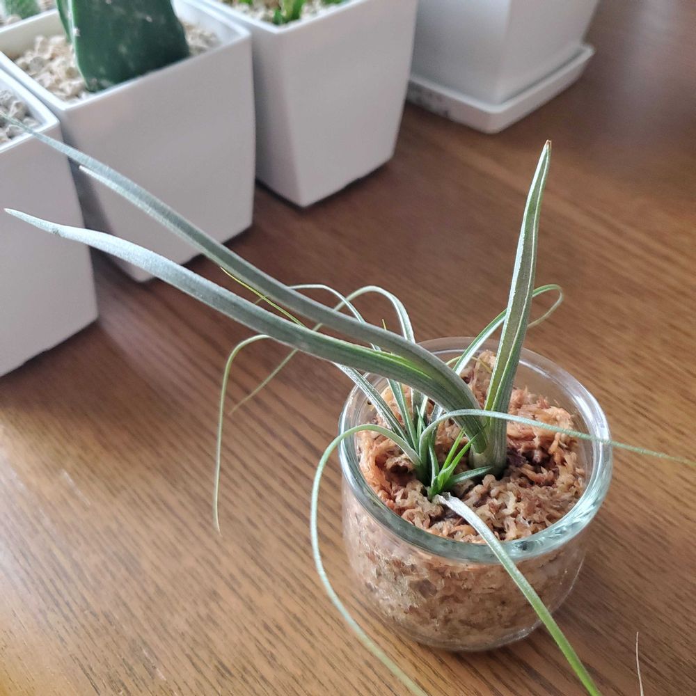 もともとコルクに縛り付けて育てていたのですが、プセウドベイレイはソーキングをしてもすぐに乾燥して葉が内側に閉じてしまっていたので水苔に挿してみました。そしたら閉じなくなり調子も良さげです😊