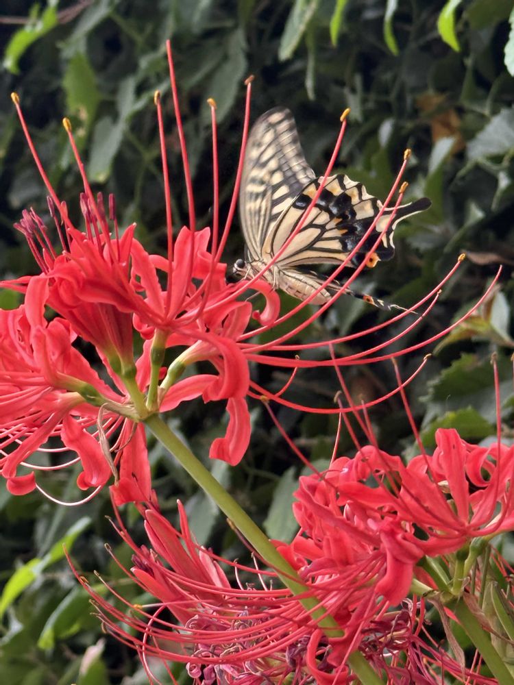彼岸花スマホ向けたらアゲハが飛んできました( 'ᴗ'o❤️o🦋•*¨*•.¸¸✧̣̇