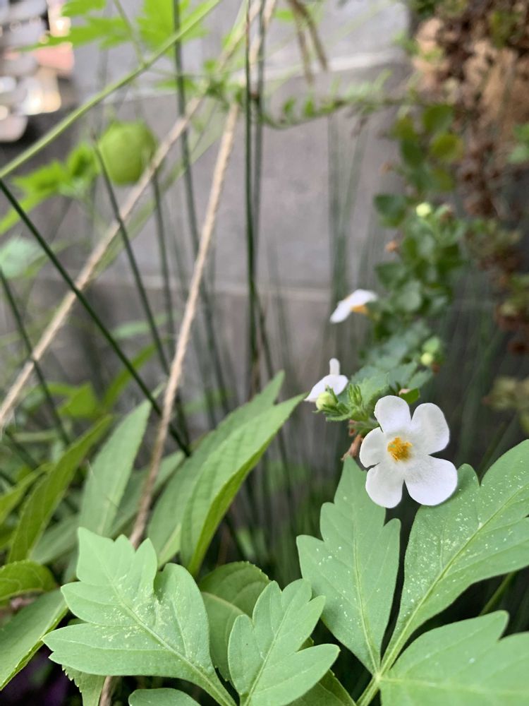 ハンギングバスケットから垂れた枝に花が咲く様子はお気に入りです
