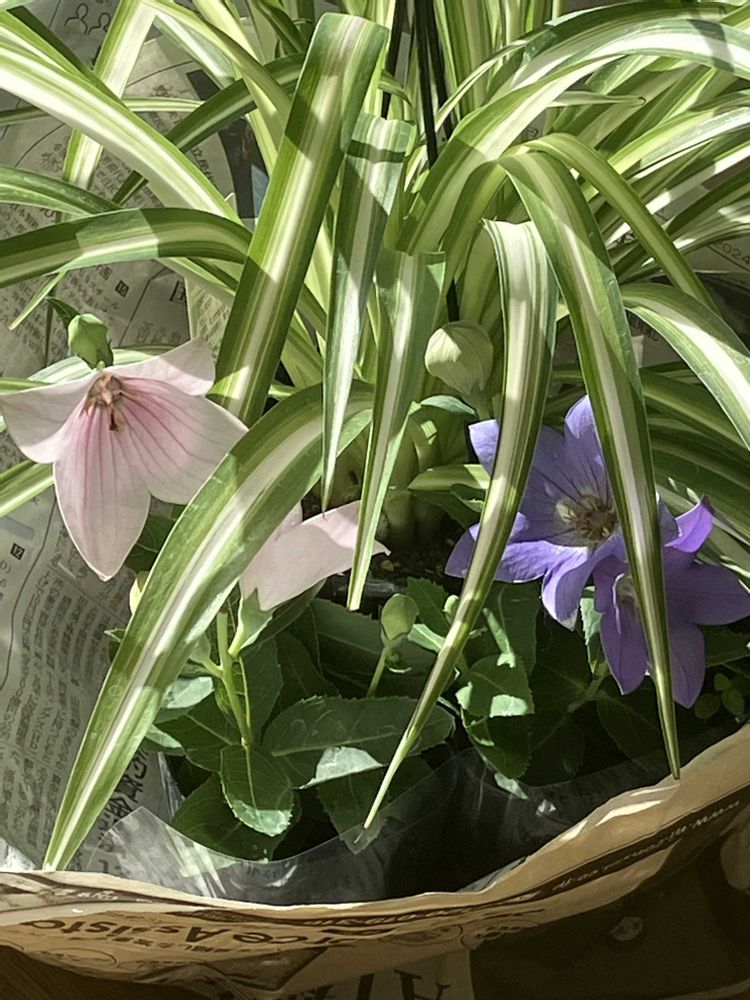 爽やかなオリヅルランの葉色と素敵に合う2色のキキョウ。