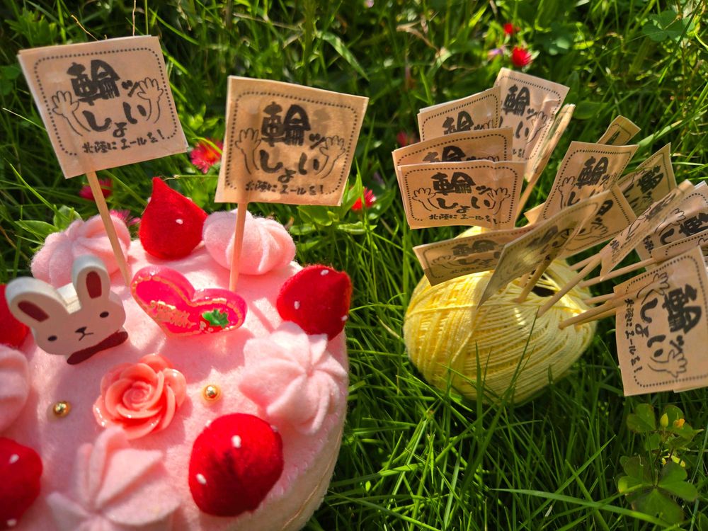 fukumomo さんから送ってもらった輪ッしょい旗のラベル、最後のニス塗り完了して、干してるところです🚩