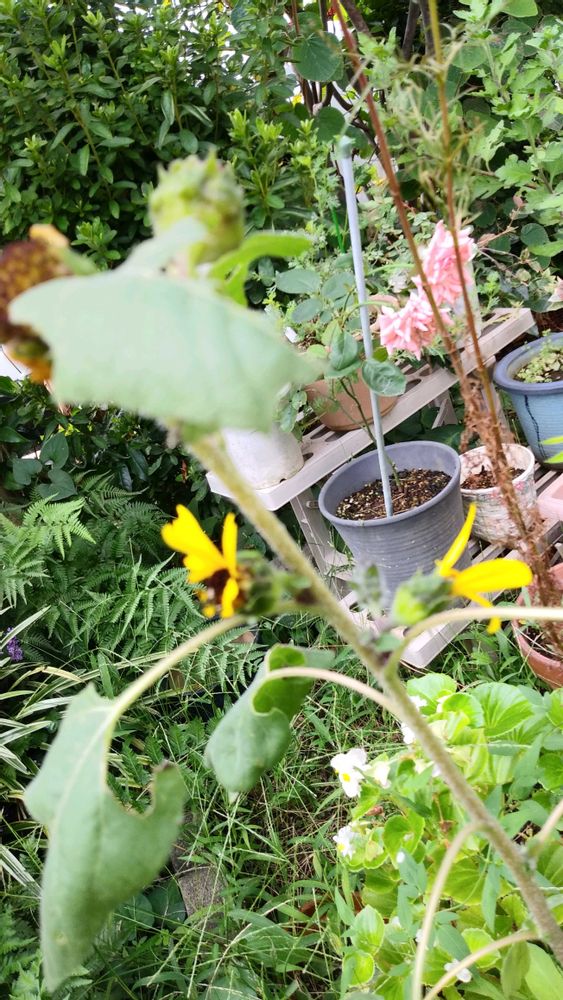 最初のは種になり下のヒマワリはさすがにミニサイズが咲いています🧡
