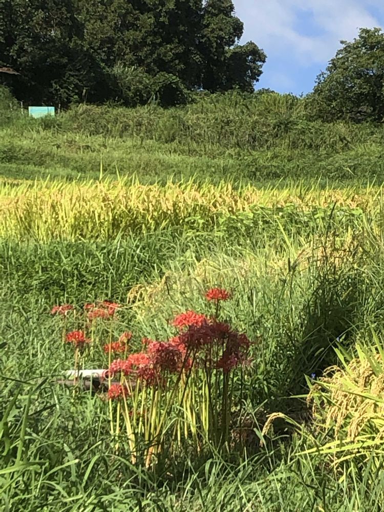 青空💙と山の木💚と稲💛とヒガンバナ♥️の色が良く合います。✌️