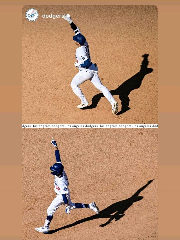 9回の大谷&ベッツのホームラン。走る影まで絵になる(大谷選手の投稿したドジャースのストーリーズより)。