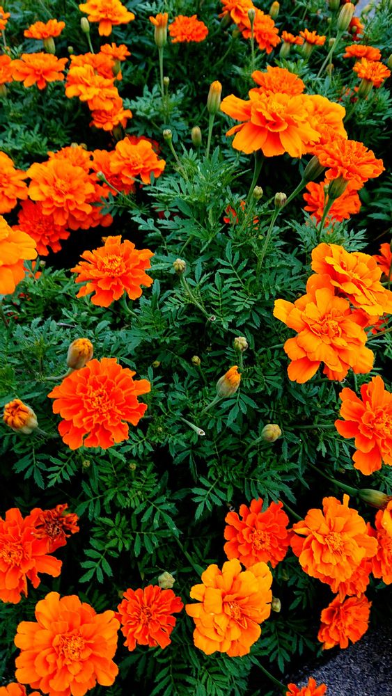 我が家のマリーゴールドさんは小さい庭で片寄せあって咲いています。
