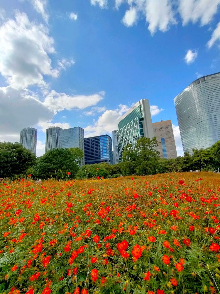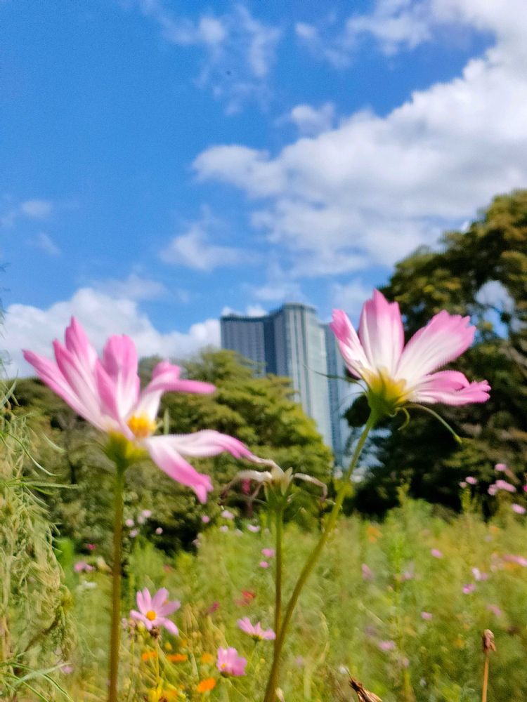 ビルとキバナコスモスと青空がとっても良いですね🏙️🌸💙