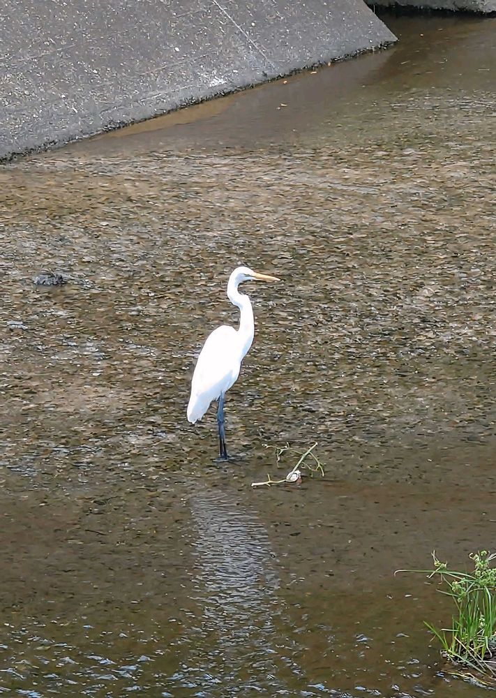 久しぶり! 元気だったかい?、シロサギくん🙋 散歩の締めくくりの川べりに出ると、突然目の前に現れました🙌