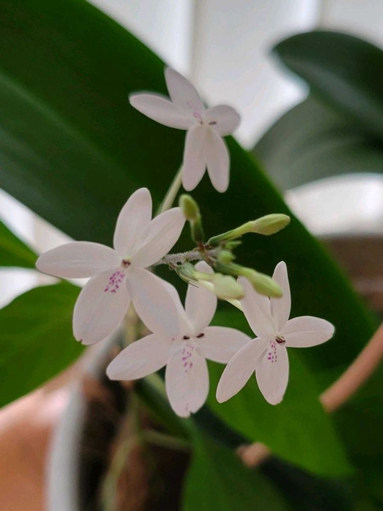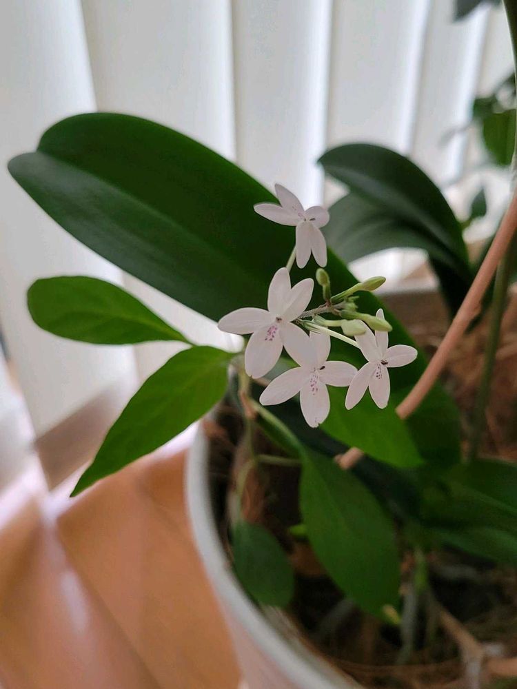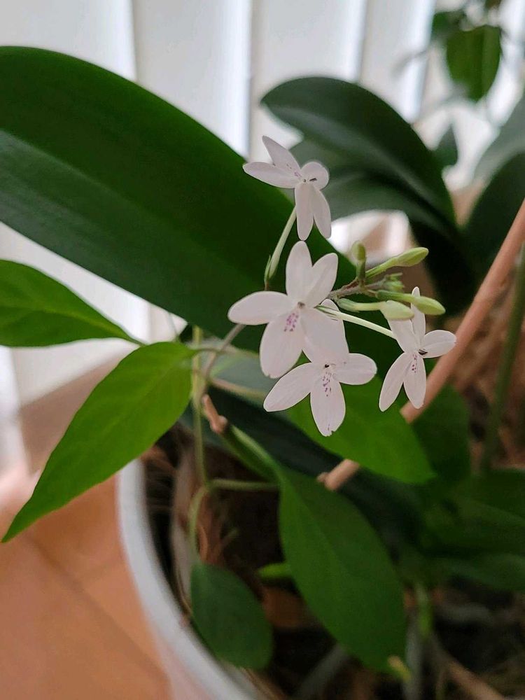 コチョウランの鉢から初見の真っ白な可愛いお花が咲きました。