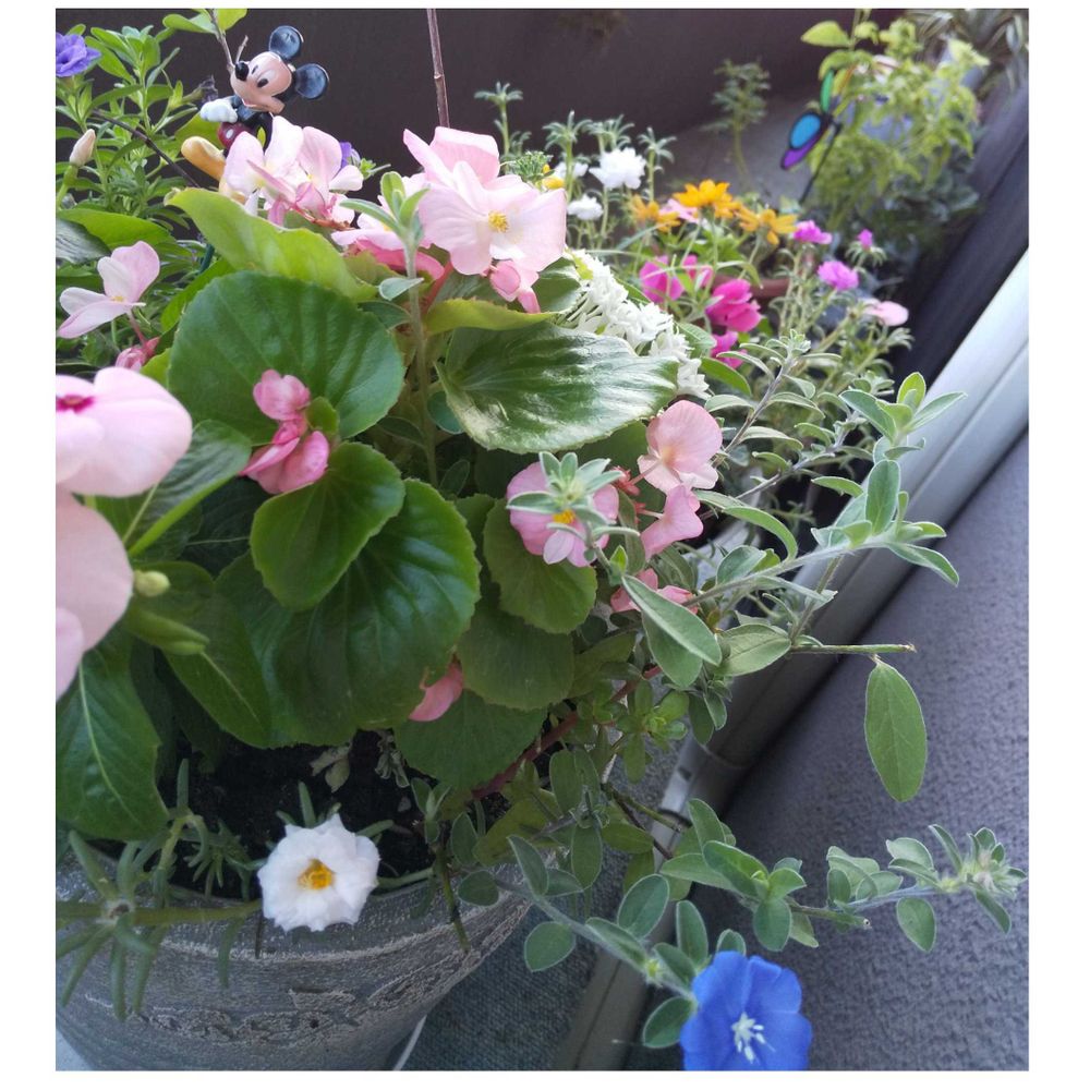 ベゴニア、アメリカンブルー1輪、マツバボタン、ジニアさんかなぁ…