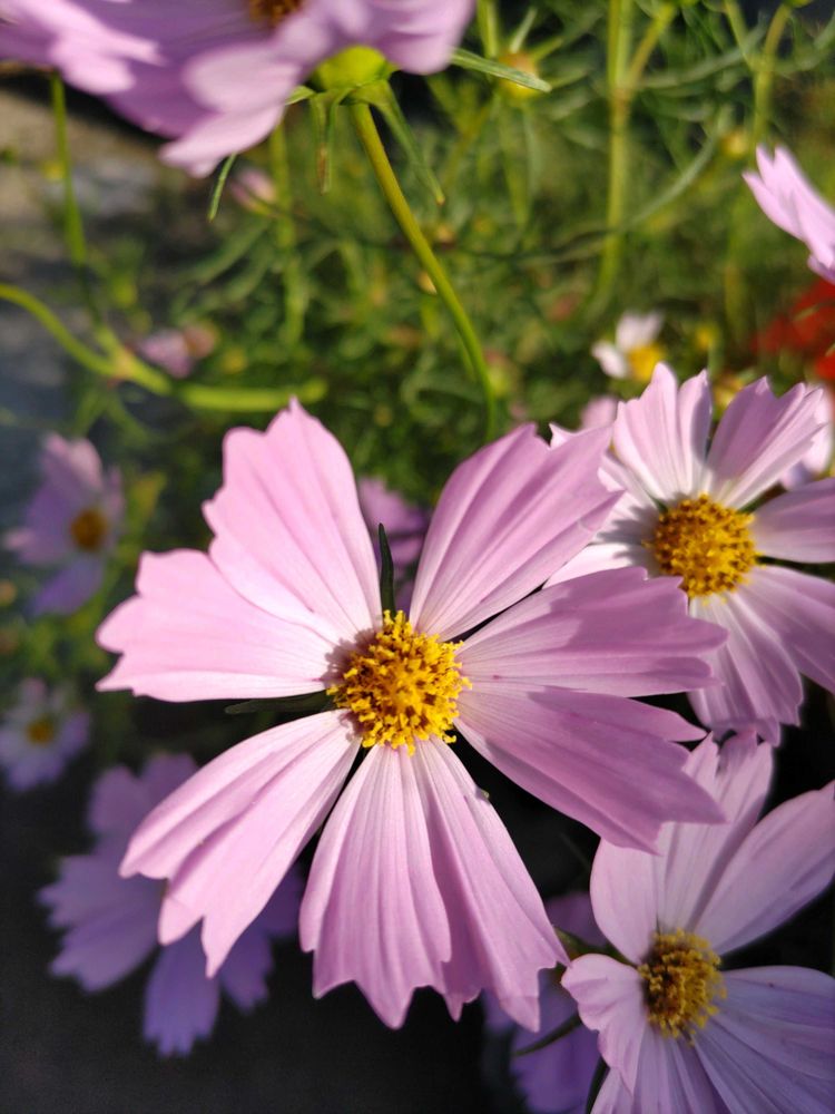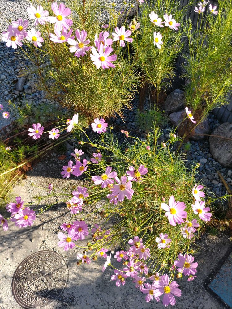 家の入り口で砕石のところに 猛暑にも負けず花をつけたコスモス(秋桜) 迷走台風接近の頃に倒れたコスモスにも途中より直立して花が咲いています🥰