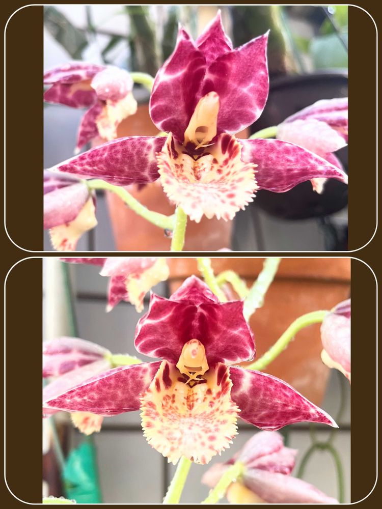 我が家のサンドラは赤系マダラとこのラベンダーレッドの掠れ模様、リップにペッパースポット入った花が咲いています。