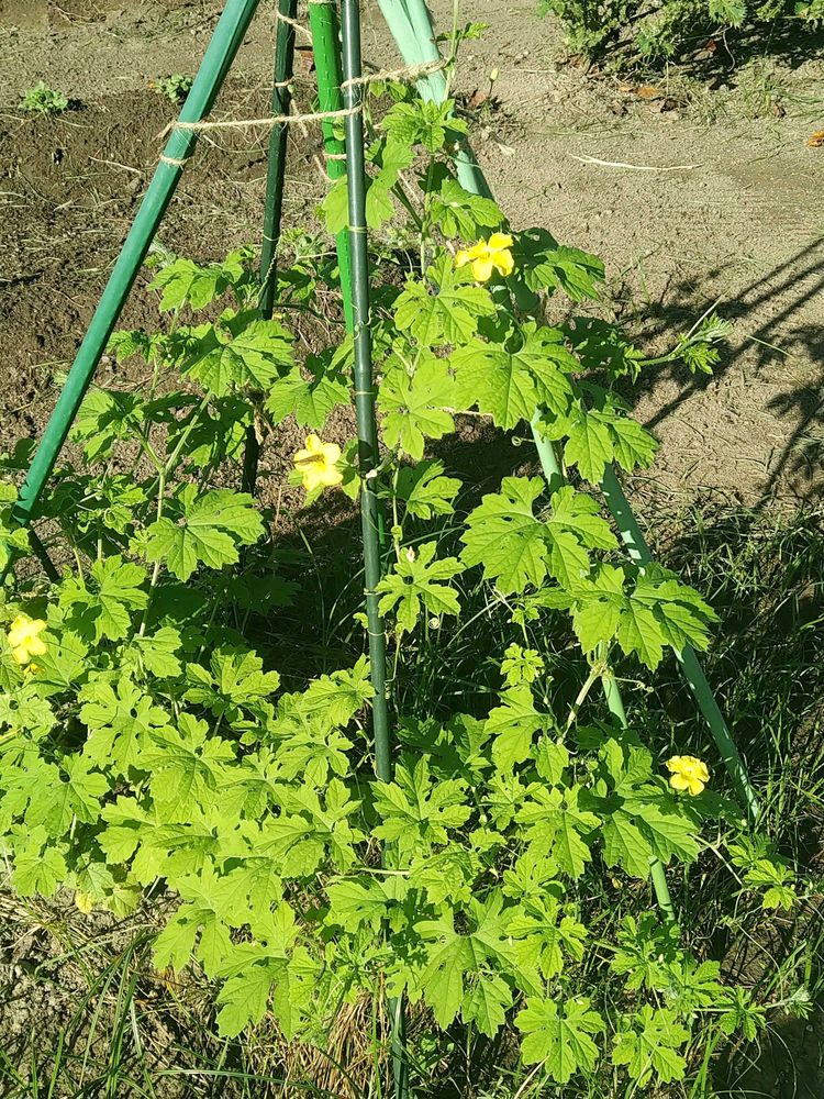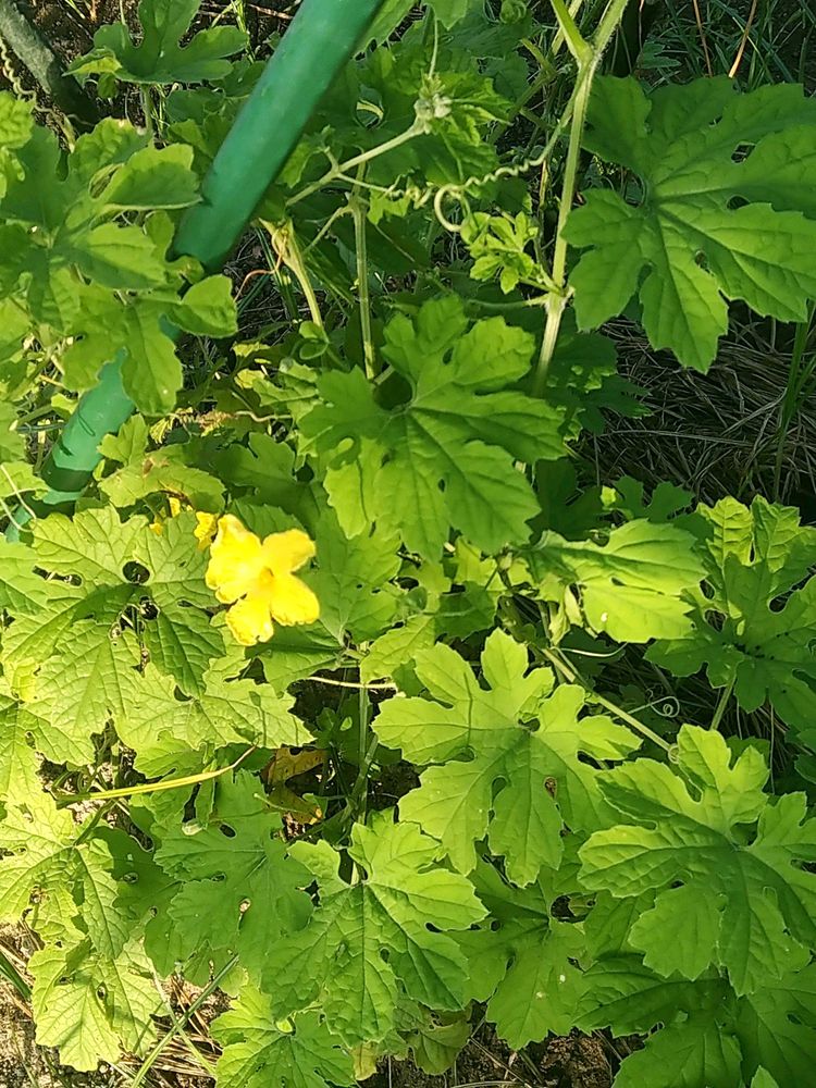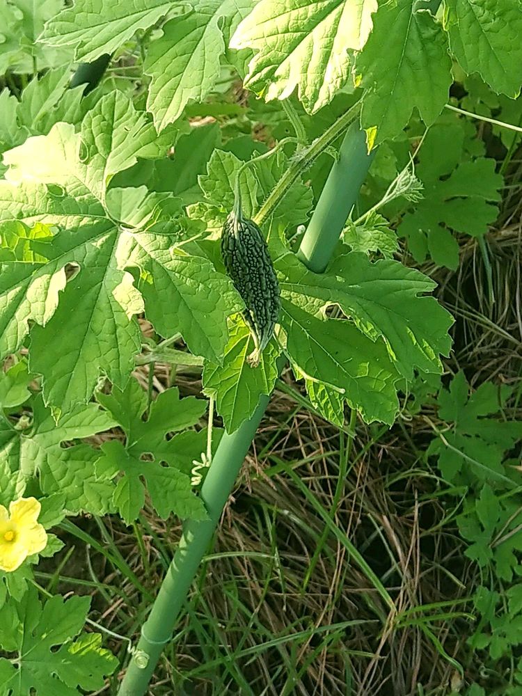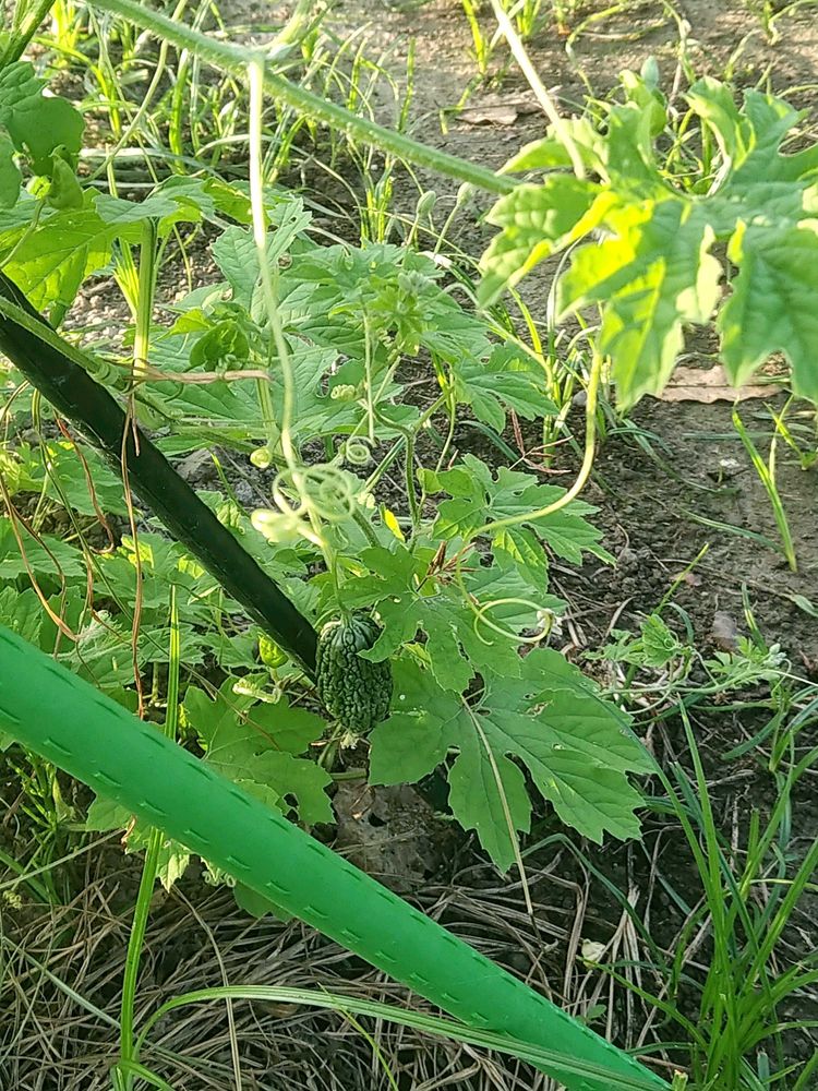 こぼれ種のゴーヤの苗を植えておいたら、小さなゴーヤがなってた😃