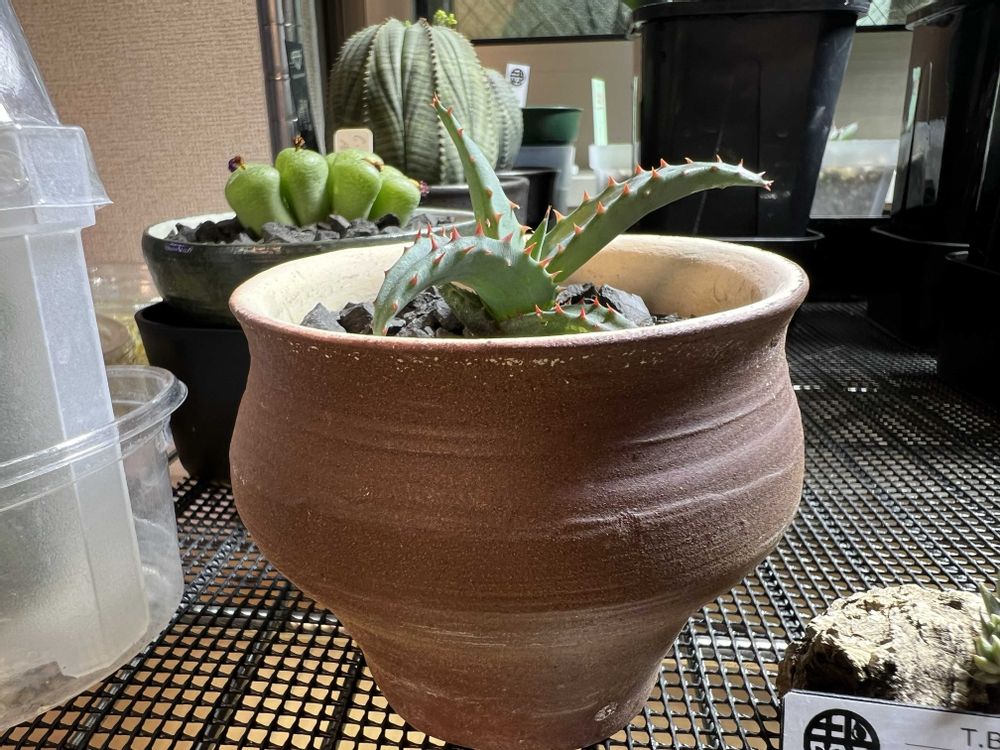 弥生土器みたいな鉢と恐竜の背筋みたいなアロエがマッチしてますね🏺🦖