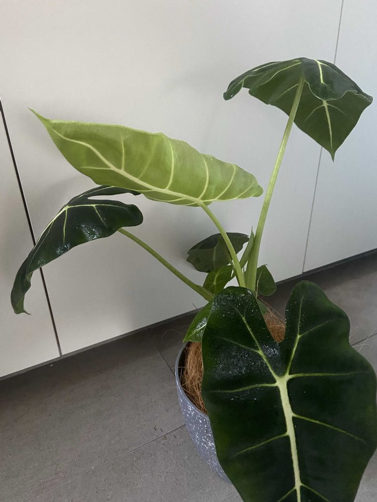 昨日、アロカシアの新葉が逆さまになっていて心配していたけど、少し倒れてきてくれてました。
